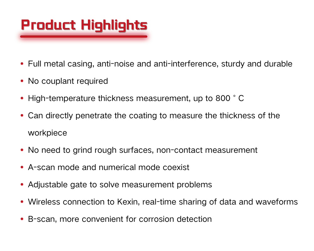 This product is easy to carry, simple to measure, and comes with functions such as A-scan (waveform display). It is an electromagnetic ultrasonic thickness gauge that integrates multiple functions.
